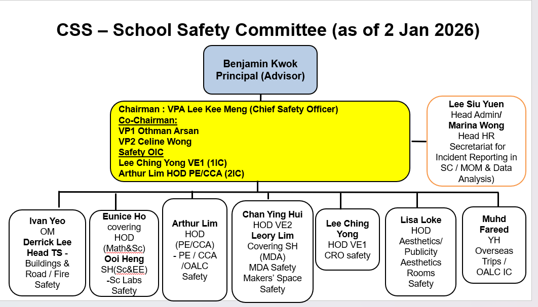 The School Safety Committee sets direction and guides safety processes in various school areas so as to provide a safe environment for teaching and learning. The SSC is headed by the Principal as the Advisor, Vice Principal (Admin) as the Chairman who is also the Chief Safety Officer and Six members.