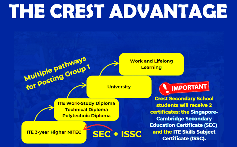 Crest Secondary School empowers every student to succeed and chase their dreams. Since 2013, we’ve blended academic learning with hands-on vocational training, giving Crestans real-world experiences that matter. Recognised with the Lee Hsien Loong Award for Innovations in Uplifting Students 2023 for our strong culture of care and inclusivity, Crest nurtures confidence, character, and strong connections through our Crafting with Heart approach. Graduates leave not just with the Singapore-Cambridge Secondary Education Certificate (SEC) and ITE Skills Subject Certificate (ISSC), but with resilience, self-belief, and future-ready skills—like Mah Yan Lin, Class of 2024, who received The Lee Kuan Yew Award for All-Round Excellence—ready to thrive in ITE, further learning, and life beyond school.