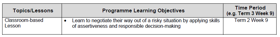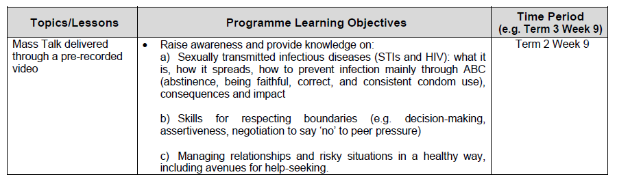 Students are taught skills such as decision-making, assertiveness and negotiation to say “no” to sex and negative peer pressure. They also learn that the impact of STIs/HIV extends beyond themselves and involves their family, and the importance of responsible decision-making and seeking help. Abstinence and upholding family values are the key messages.