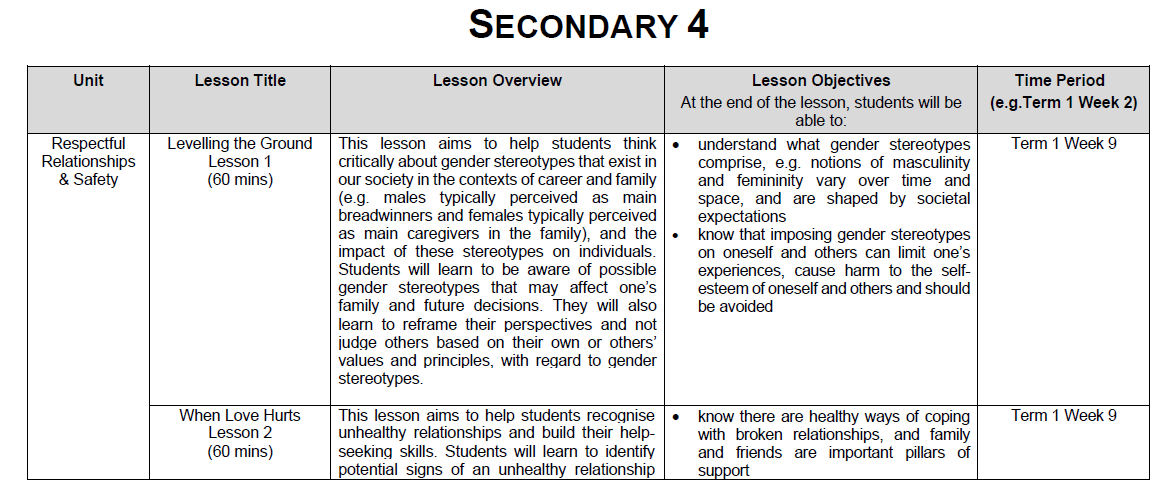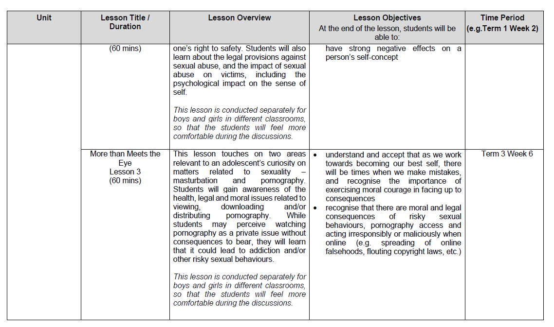 Sexuality Education is delivered in a holistic manner through the school curriculum. The content for Sexuality Education is grouped into five main themes: Human Development, Interpersonal Relationships, Sexual Health, Sexual Behaviour, and, Culture, Society and Law. You may click here for more information on the scope of Sexuality Education in the school curriculum.