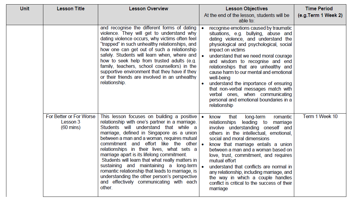 Sexuality Education (SEd) in schools aims to enable students to understand the physiological, social and emotional changes they experience as they mature, develop healthy and rewarding relationships with others, including those with members of the opposite sex, and make wise, informed and responsible decisions on sexuality matters. SEd is premised on the importance of the family as the basic unit of society. This means encouraging healthy, heterosexual marriages and stable nuclear family units with extended family support. The teaching and learning of SEd is based on respect for the values and beliefs of the different ethnic and religious communities in Singapore on sexuality issues.